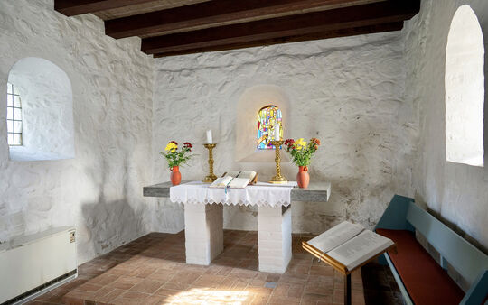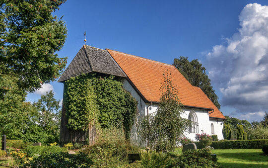 Ein Schalenstein aus vorgeschichtlicher Zeit an der Nordwand im Kirchenschiff zeugt von einer frühen Kult- und Begräbnisstätte auf dem hoch über der Schlei gelegenen Friedhof um die wohl Ende des 12. Jahrhunderts erbaute Kirche. Der kleine, weiße Feldsteinbau hat sich ohne spätere Erweiterungen auf seinem ursprünglichen Grundriss erhalten. Am Chor und an der Nordseite des Schiffes sind die kleinen romanischen Rundbogenfenster wieder geöffnet.
