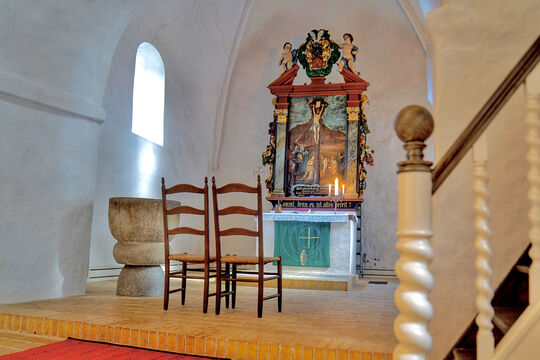1682 wurde der Altaraufsatz mit der Kreuzigungsszene vom Gründer des Gutes Winning, Joachim Schmidt, gestiftet. Sein Wappen ziert nun den Altar.