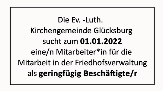 Bitte senden Sie die Bewerbungsunterlagen an die Evangelisch-Lutherische Kirchengemeinde Glücksburg, Waldstr. 11, 24960 Glücksburg.