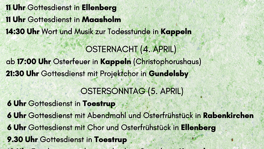 Zwischen Schlei und Ostsee bilden die Kirchspiele Ellenberg, Kappeln und Gundelsby-Maasholm seit dem 1. November 2021 die Ev.-Luth. Kirchengemeinde St. Christophorus Ostangeln. Ca. 5800 Menschen gehören zu uns - im Winter. Im Sommer gehören wir zu der Urlaubsregion, die sich seit Jahren wachsenden Beliebtheit erfreut. Auch das immer noch wachsende Feriengebiet Olpenitz sowie die entstehenden Schleiterrassen gehören dazu. Wir sind Teil des Pfarrsprengels Ostangeln, zu dem noch die Kirchengemeinde Arnis-Rabenkirchen und Toestrup gehören und mit denen wir einen regen Austausch pflegen.