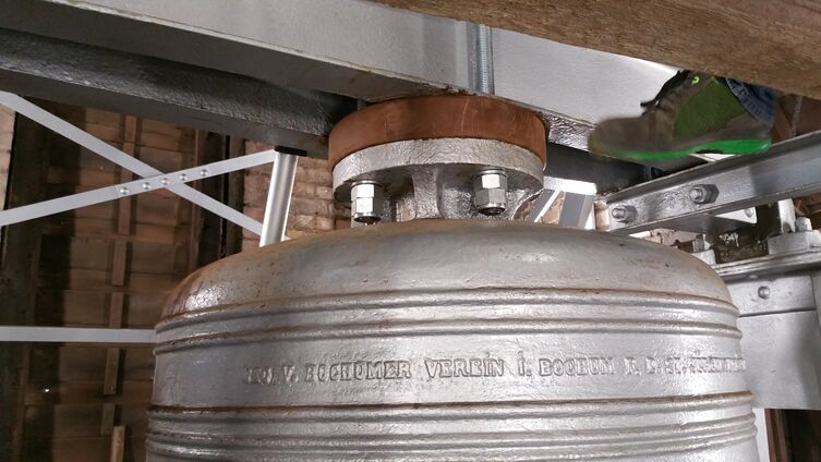 Nachdem der Glockenstuhl und die drei Glocken der St. Jürgen Kirche im Juni letzten Jahres mit Rostschutz neu geschützt worden waren, erneuerten die Monteure der Fachfirma jetzt das Kronholz der großen Glocke.