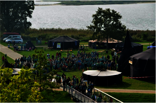 In einem großen Zeltdorf bieten die Pfadfinder ein abwechslungsreiches Outdoorprogramm mit Essen am Lagerfeuer und vielen Mitmachaktionen an.