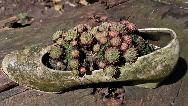 Ein seltsames Fundstück, versteckt zwischen Blättern und Holz in einem Garten am Wegrand. Ein Schuh allein. Ausgetreten, wie viele Wege mag er seine Trägerin begleitet haben, mal leichte und mal schwere.