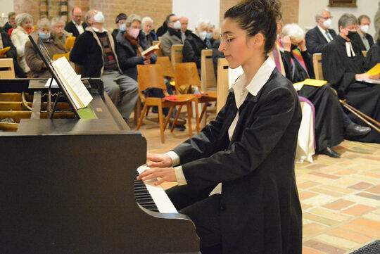 Mit viel Energie und sichtbarer Freude spielte Mahela Reichstatt im Gottesdienst die Orgel, begleitete die Gemeinde am Flügel und leitete den Domchor, die Domkantorei und den Bläserchor.