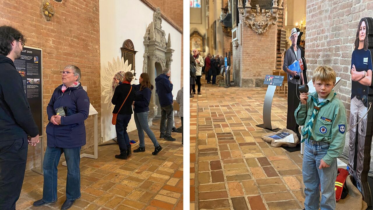 Nach einem vielfältigen Gottesdienst zum Thema Erntedank in Zeiten von Klimakrise und Klimaflucht, gestaltet durch verschiedene Arbeitsbereiche des Kirchenkreises (Kulturmanagement und Kirchenpädagogik Dom, Klimaschutz, Ökumene, Flucht und Migration), Propst Helgo Jacobs und Popkantor Patrick Zinndorf, war es so weit: Die Wanderausstellung der Deutschen KlimaStiftung, die im Oktober und November im Schleswiger Dom zu sehen ist, wurde eröffnet. Die Gottesdienstbesucher*innen waren die ersten, die die Ausstellung entdecken konnten.