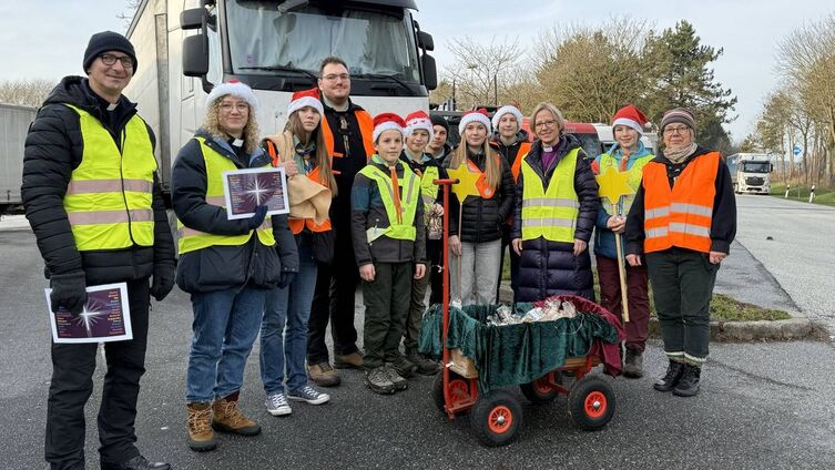 Bischöfin Nora Steen, Pastor Witold Chwastek, Pastorin Jessika Gude und Pfadfinder aus Angeln haben am Rastplatz Hüttener Berger Lkw-Fahrer besucht.